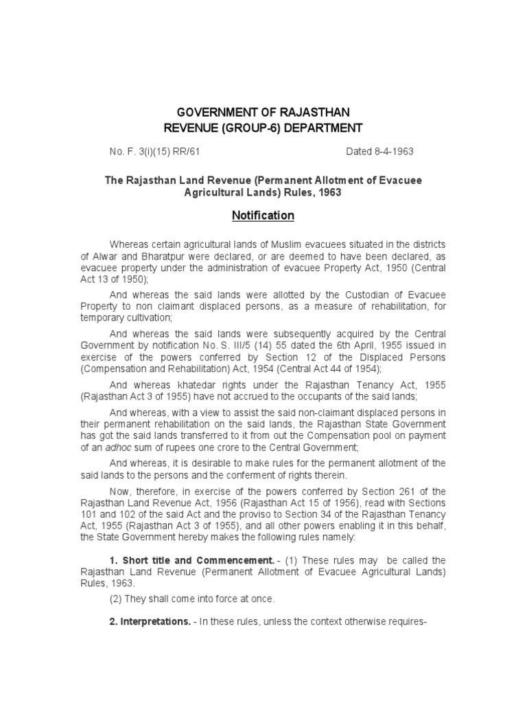 Rajasthan Land Revenue Rules Guide Permanent Allotment Evacuee